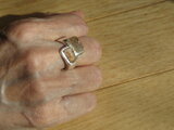 リングのサイズは13.5号、重さは12g、最大幅は17mm、手のひら側は6mm、金属部分は純銀です。