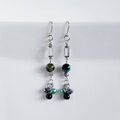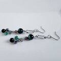 シャープな長方形デザインがとてもお洒落なアクリルフレームストーンにまるで宇宙のような幻想的な色合い素敵なミックスカラータイガーアイ、それに合う3色の2サイズ小さめのガラスビーズをちょこんと合わせた揺れ感あるお洒落なピアスとなっております☺