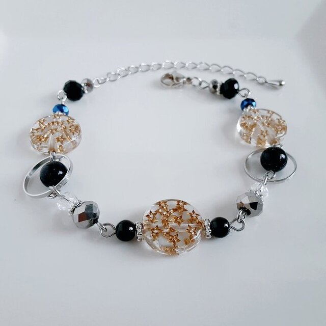 とても可愛らしい模様が施されたコイン型のアンティーク風アクリルビーズをメインにまるで煌めく夜空のようなラメが素敵なブルーゴールドストーンを真ん中に合わせたサークルフープ、大人っぽいダークな色合いが綺麗なガラスビーズなどを合わせたお洒落なブレスレットとなっております☺
