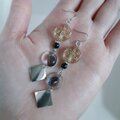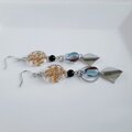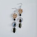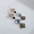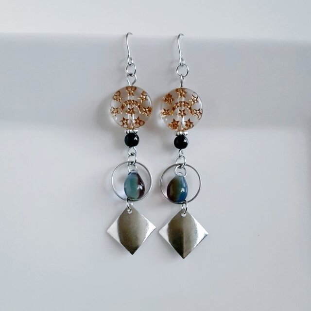 とても可愛らしい模様が施されたコイン型のアンティーク風アクリルビーズをメインにぷっくり可愛いダークなドリーム色のしずくビーズが真ん中で揺れるサークルフープと少しひねりが入ったようなフォルムが素敵なスクエア型のメタルプレートを合わせたお洒落なピアスとなっております☺