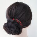 濃い茶色地が髪色に馴染み、その中に鮮やかな赤色が映えるエレガントなデザイン。シンプルな三日月型でありながら、手の込んだ繊細な花細工に思わず目を惹かれます。