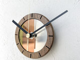 独特な模様を持った金属板とシンプルなウッドフレームを組み合わせることで素材のコントラストが楽しめ、小さいながらも存在感のある時計です。
