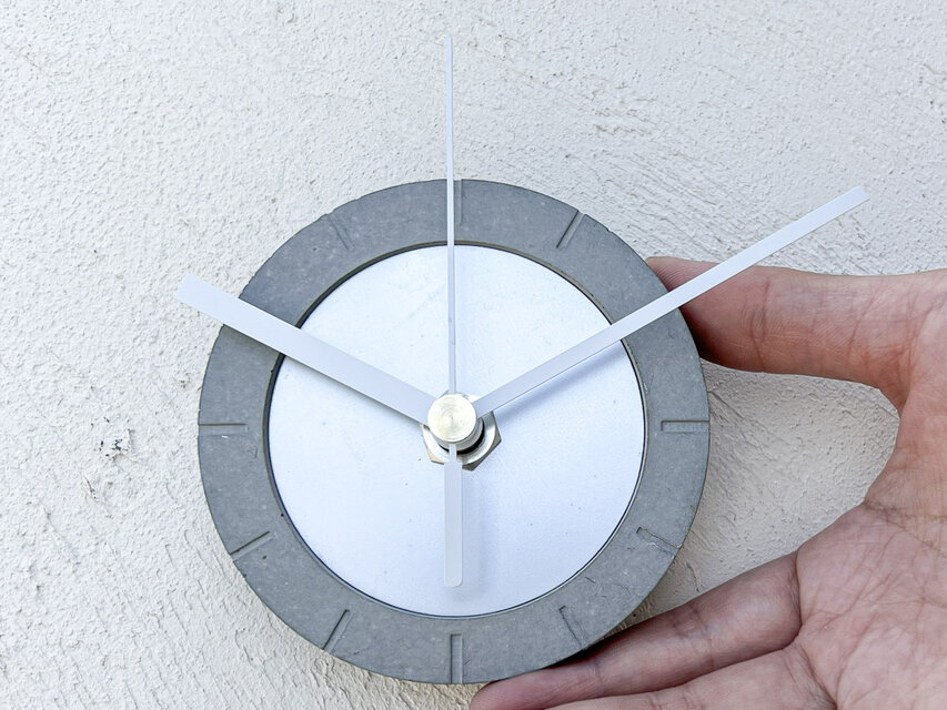 独特な模様を持った金属板とフラットな雰囲気のセメントを組み合わせることで素材のコントラストが楽しめ、小さいながらも存在感のある時計です。