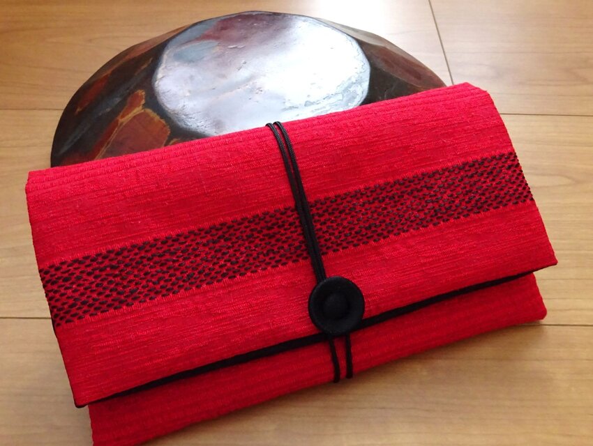 刺し子をあしらった帯から仕立てたボタン留めのポーチです。