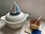 シンプルなキッチンに映えるキレイな色の鍋つかみです。