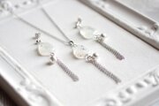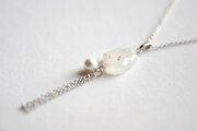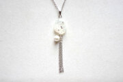 白のマーブル模様と控えめに入れたラメのきらめきが美しい凹凸のレジンにコットンパールとフリンジをあしらったペンダント。