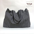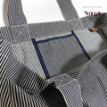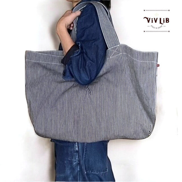 国産・岡山デニム(9オンス)のセルビッチ(赤耳)ヒッコリーストライプ生地で仕立てた、軽くて使いやすい大容量のトートバッグです。