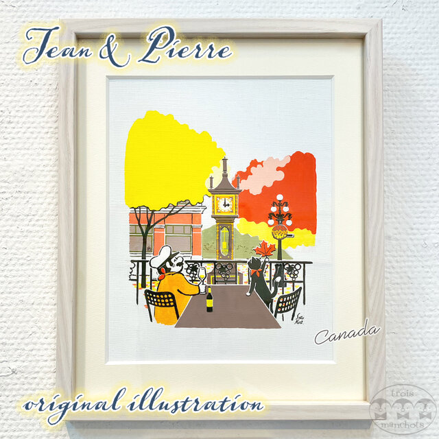 ねこのジャンと船乗りのピエールが、カナダ ・バンクーバーのカフェでゆったり過ごしているイラストの原画です。