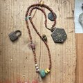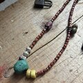 間にはベネチアの樽型のスジ玉、チイさんシェブロンだまアジアの少数民族渡りの古い小さな蜜柑玉、足付きのロータス刻印の真鍮ビーズ、ヘブロン玉の黄色、銅色のメタルビーズなどを散らしてつなぎました。