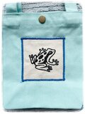 ミントグリーンの洗いざらいのような手触りの良い柔らかなキャンパス地に、絵の額を思わせるような青い縁取りを施したカエルのワンポイントがアクセント。
