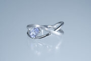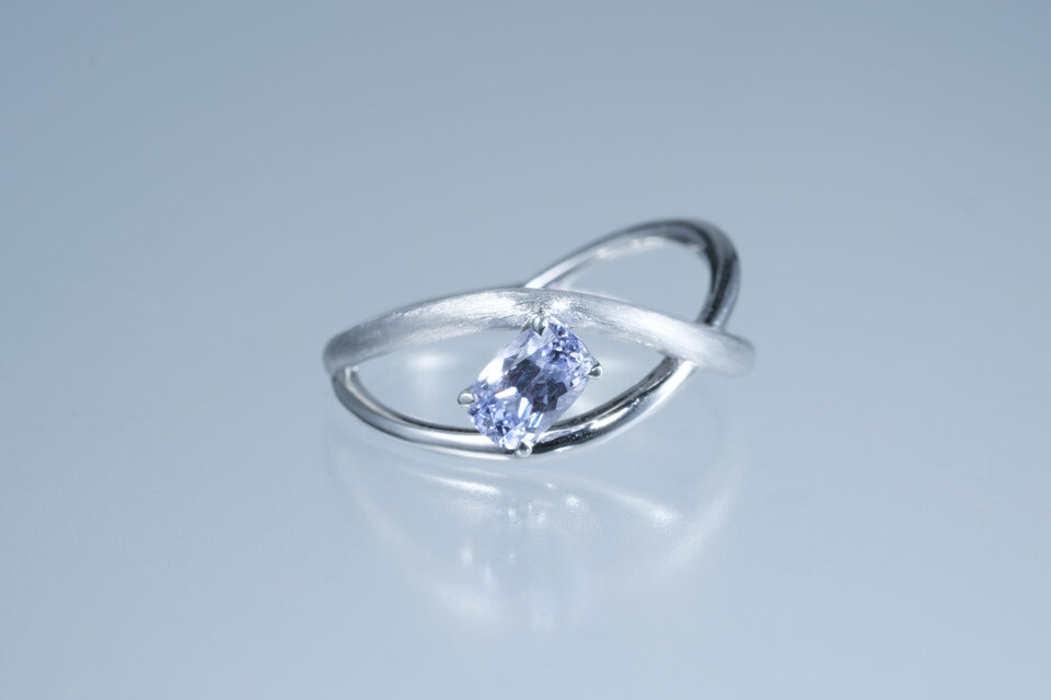 躍動的に交じり合うリングに、透明感あふれるヴァイオレットスピネルを配置しました。