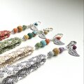 カンタビーズは「カンタキルトビーズ」と呼ばれており、アップサイクルサリーを材料に作られています。インドの女性職人の方々の手により、小さくカットし、ウッドビーズに貼り付けるという大変細かい作業ですが、とても丁寧に仕上げられています。中のウッドビーズも使用されなくなった家具を再利用して作られています。(カンタビーズはフェアトレードに認証されています)