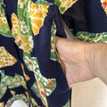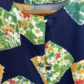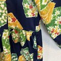 小紋の着物からリサイクルしたワンピースになります。濃紺の地に黄色、黄緑色、緑色の花模様の千代紙を散らしたような艶やかな柄です。