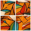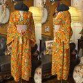ビビッドなオレンジをベースに、グリーン・ブルー・イエローの葉っぱモチーフが重なり合うように配置された、レトロポップ全開の着物地を使用したリメイクワンピース。