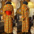 【 和洋折衷ロングワンピース 着物アンサンブル 名古屋帯サッシュベルト付き ハンドメイド レトロ 古着 オレンジ×幾何学 aKW-105 】