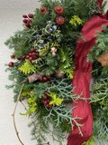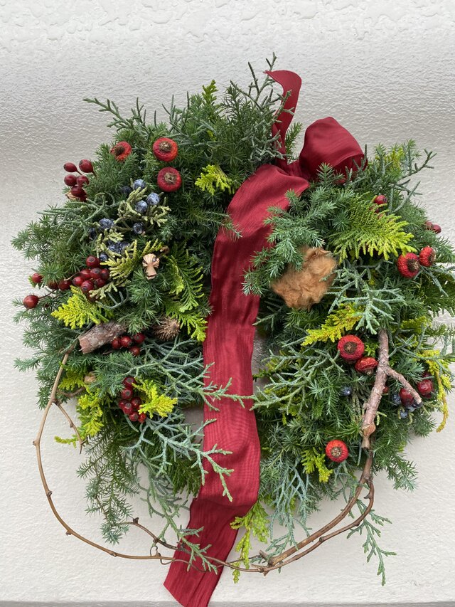 赤い木の実がたくさん使われ緑の葉っぱとのコントラストがとてもセンスの良いリースで一足先にクリスマスを迎えた気分になりました.
