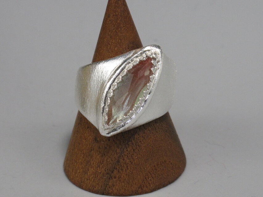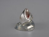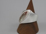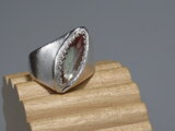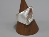 リングのサイズは13号弱、重さは8g、最大幅は18mm、手のひら側は4mm、金属部分は純銀です。