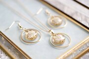 レジンとリングパーツがデコルテで輝くさまがなんともいえず華やかです。