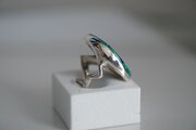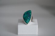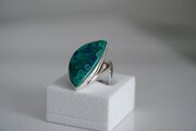 深いブルーのアズライトと鮮やかなグリーンのマラカイトが混り合った天然石をアートピースのような立体的なフォルムの艶やかなシルバーで仕上げたリングです。sv925を用いたフレームは直線と曲線が調和するユニークな構造です。