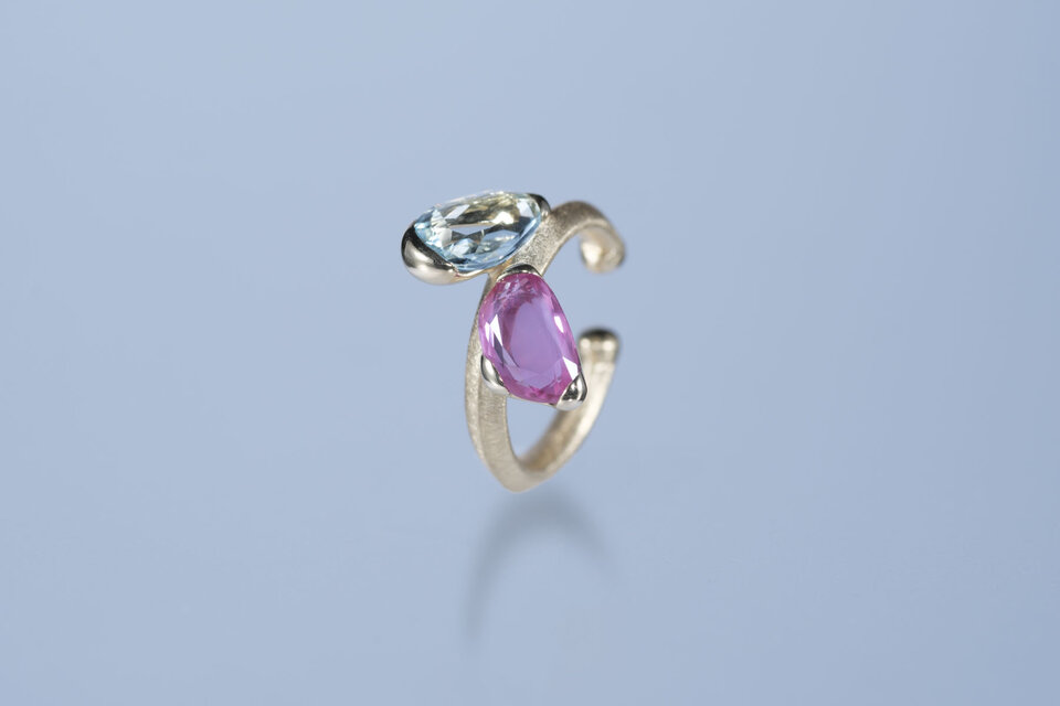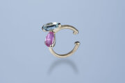 やや紫がかったピンクのサファイアと涼やかなアクアマリンを立体的に配置したイヤカフスです。
