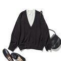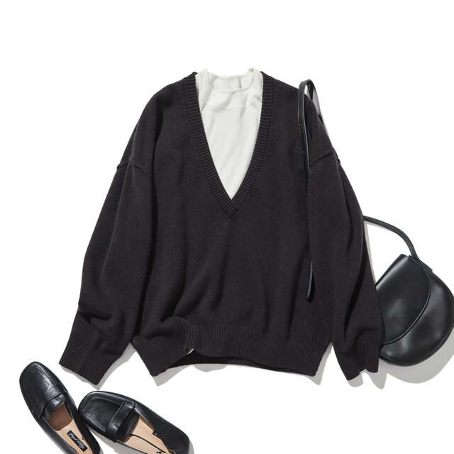 • 抜け感のあるVネック: 深めのVネックが首元をすっきりと見せ、顔周りを引き立てます。この開き具合が、さまざまなインナーとの重ね着を可能にし、着こなしの幅を広げます。