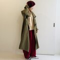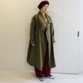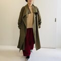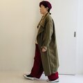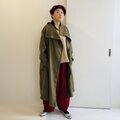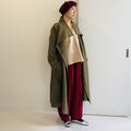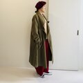 カーキ色は黒やベージュとも合わせやすく、また写真のような赤や明るめのカラーとも相性が良いです。サッと羽織れるこだわりの日常着としていかがでしょうか。