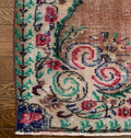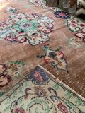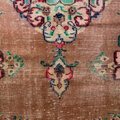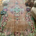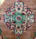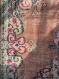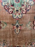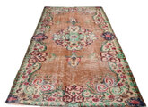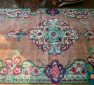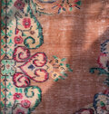 テラコッタオレンジのベースに、メダリオンや縁取りにはルビーレッド、ペパーミントなど、個性的なレトロ色使いがとっても雰囲気があり素敵なヴィンテージラグ
