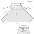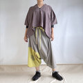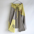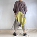優しい履き心地の三角の形のパンツです。2種類の生地をたっぷりと使ってゆったりとした作りです。ウエストはチベタンスカートと呼ばれる形を参考にしたつくりです。脇の紐を結んでウエストを調節し、余った脇の布を前で結びます。脇の片側はボタンにしましたのでご自分のウエストに合わせてボタンの位置を調整していただくことも可能です。