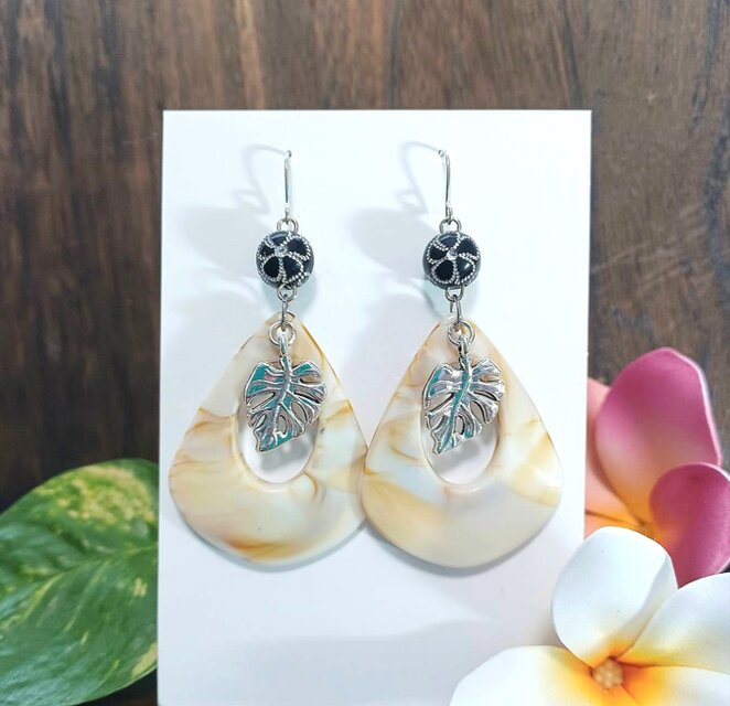 モンステラ大ぶりピアス❀.*・゚ マーブルブラウンホワイト 黒花プルメリア❀ハンドメイド No.296