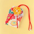 お守り袋には柄に合わせて作ったつまみ細工の黄色い花を添えました。