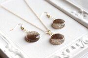 切り取ったかのようなラメのレジンと落ち着いたブラウンのレジンを組み合わせた、印象的なピアス。