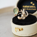 今回使用している石は、内側から光るような自然な透明感を持ち、やわらかな金色のK10とも相性が良いものを選んでいます。