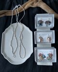 作品をお送りいただきありがとうございます。オパールのネックレスの遊色があまりにも綺麗で、虹色に輝いていてとても感動しました。アクアマリンのピアスも色のグラデーションが美しく、小さな石が揺らめく様子がとても軽やかで素敵です。大切に使用させていただきます。