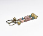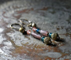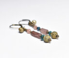 パープルローマングラスとインディゴブルービーズ、アンデシン、つぶつぶブラス、民族鈴を繋いだピアスです。