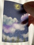 サンタクロースが月の光を浴びながら、夜空を駆け抜ける様子を描いたカードです。