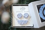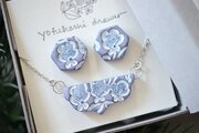 草花をモチーフに消しゴムはんこを彫り、はんこを陶土に捺しつけて凹凸の模様をつけた耳かざりとネックレスのセットです。
