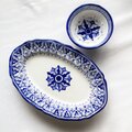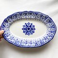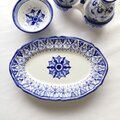 ブルー一色で描いた幾何学模様、エレガントなオーバル皿。