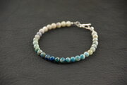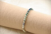 アフガニスタン産ハックマナイトのブレスレットです。 ハックマナイトはソーダライトの変種で、紫外線に当たると変色して色が濃くなり、時間が経過すると元の色に戻るという「テネブレッセンス」または「フォトクロミズム」という不思議な性質をもつ石です。石はロシアのコラ半島で発見され、フィンランドの鉱物学者であるビクトル・ハックマン氏に因んで名付けられました。白、グレー、紫、緑、青など色彩豊かで楽しさと喜びを与えてくれる天然石です。デニムと好相性です。