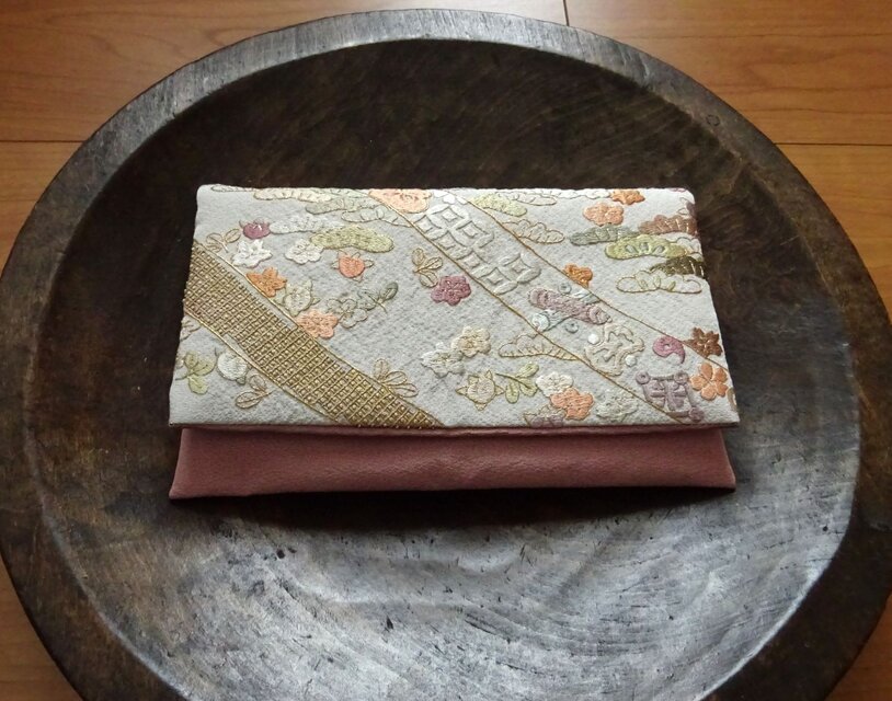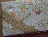 総刺繍のとても華やかな長着を蓋部分にもってきて無地とつないだお懐紙入れです。柄が刺繍ですからとても手の込んだものです。