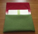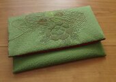 渋い緑の地にドロンワークや相良刺繍で柄をあしらった長着から仕立てたお懐紙入れです。とても手の込んだ刺繍です。柄取りの関係で後ろで無地部分とつないであります。
