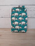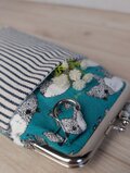 ストライプときれいなエメラルドグリーンのバクさんの柄が個性的な組み合わせのがま口スマホショルダーです。