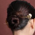 イチョウの葉をテーマにしたかんざしです。金色を基調としたデザインに、ネフライトの葉を中心に配置しました。さらに、下部の揺れる部分が上品に揺れ動きます。このかんざしは、秋の風情を感じさせるデザインで、和装にも洋装にも合わせやすいアクセサリーです。イチョウの葉の形状が繊細に表現されており、金色の輝きが華やかさを添えます。ネフライトの深い緑色が中心に配置され、自然の美しさを引き立てています。揺れる部分が動くたびに、光を受けてきらめき、見る人に優雅な印象を与えるでしょう。特別な日の装いに、または日常の中に少しの贅沢を加えたいときにぴったりの一品です。