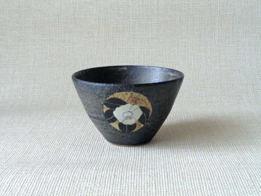 落ち着いた黒釉に華やかに描いた白椿が映え、和の美しさと季節が感じられる作品です。