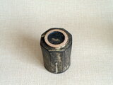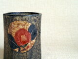 この作品は、信楽の土を使いろくろで成形後ヘラで押さえて八角にした湯のみに、少しづつ加彩し焼成を重ねています。独自に調合した釉を用いて椿を丁寧に手描きしています。金や銀で椿に華やかさを添えています。花弁に美しく貫入が入っています。