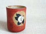 この作品は、信楽の土を使いろくろで作った湯のみに少しづつ加彩し焼成を重ねています。独自に調合した釉を用いて椿を丁寧に手描きしています。赤絵付は均一にせず手仕事の温かさが感じられるようにしています。軽くて持ちやすく口当たりも滑らかです。金や銀を使っての絵付けは技術的に難しく、作業時の温度・湿度管理に気を遣い仕上げています。