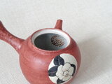この作品は、信楽の土を使いろくろで作った急須に白い釉をかけ本焼後赤絵付をしています。その後、椿を手描きで丁寧に少しづつ加彩し焼成を重ねて仕上げています。赤絵付は均一にせず手仕事の温かさが感じられるようにしています。内側は釉薬をかけ、茶こし穴は細かい穴を丁寧に開けています。注ぎやすく湯切れも抜群です。蓋もすり合わせが良くぴったりです。金銀・色絵などの絵付けは技術的に難しく、作業時の温度・湿度管理に気を使って仕上げています。作陶から仕上げまで時間をかけて完成させた希少な作品です。