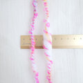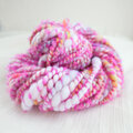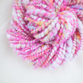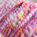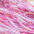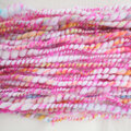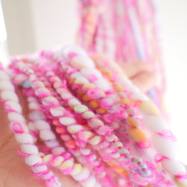 ピンク色のループヤーンを添えたアートヤーン系の手紡ぎ糸。