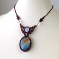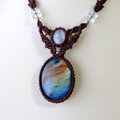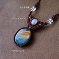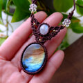 ラブラドライトの中でも珍しいブルー、グリーン、オレンジ、イエローなど虹色に艶やかに輝くラブラドレッセンス(シラー)が魅力的で印象的な大きめのマルチカラーラブラドライトをメインに見る角度で青白く光り輝くブルーシラーが現れるムーンストーンを合わせたマクラメ編みペンダントネックレスです。