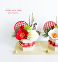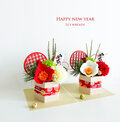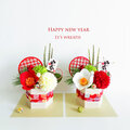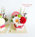 赤い紋様プレート、迎春ピック、水引飾り、ちりめんボールなど、和のアイテムたちも、華やかにお正月を彩ります。