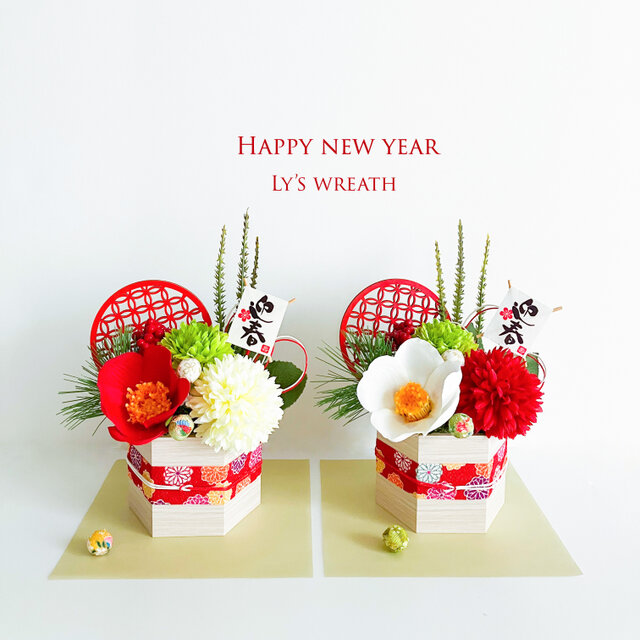 紅白の色合いと可愛らしい雰囲気に、明るいお正月と縁起の良さを感じる、椿&マムのアレンジメントです。